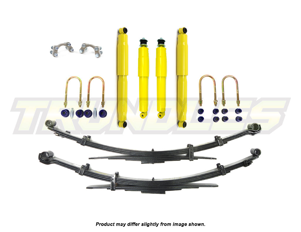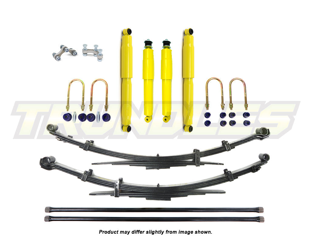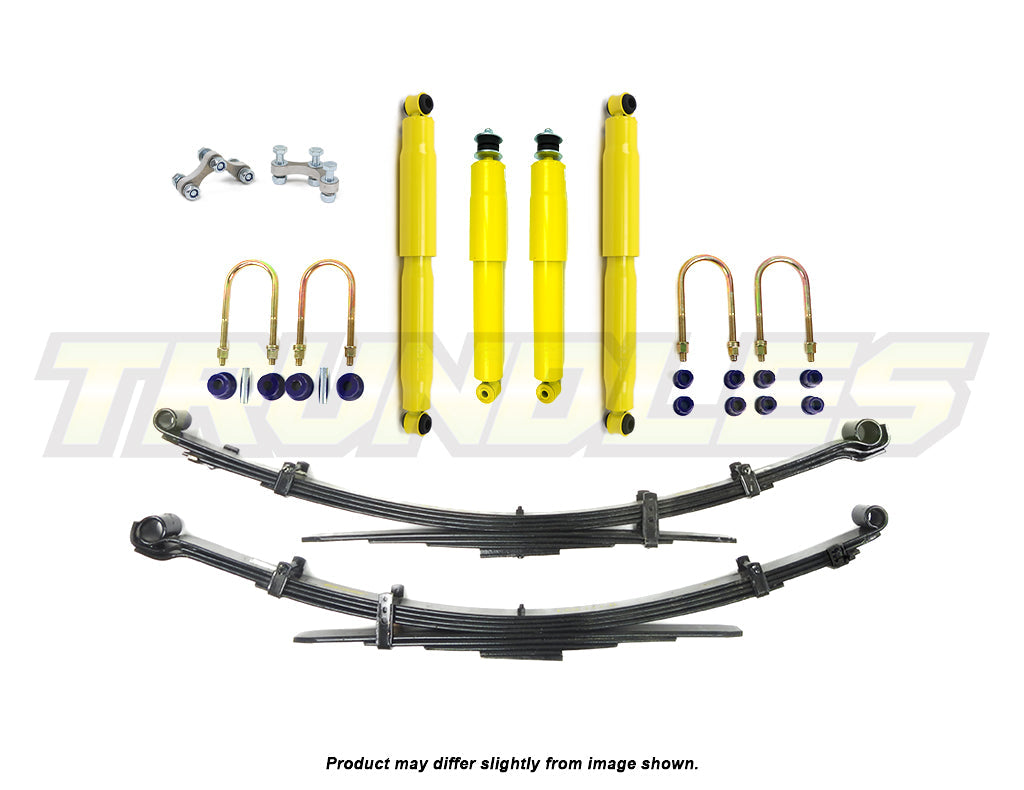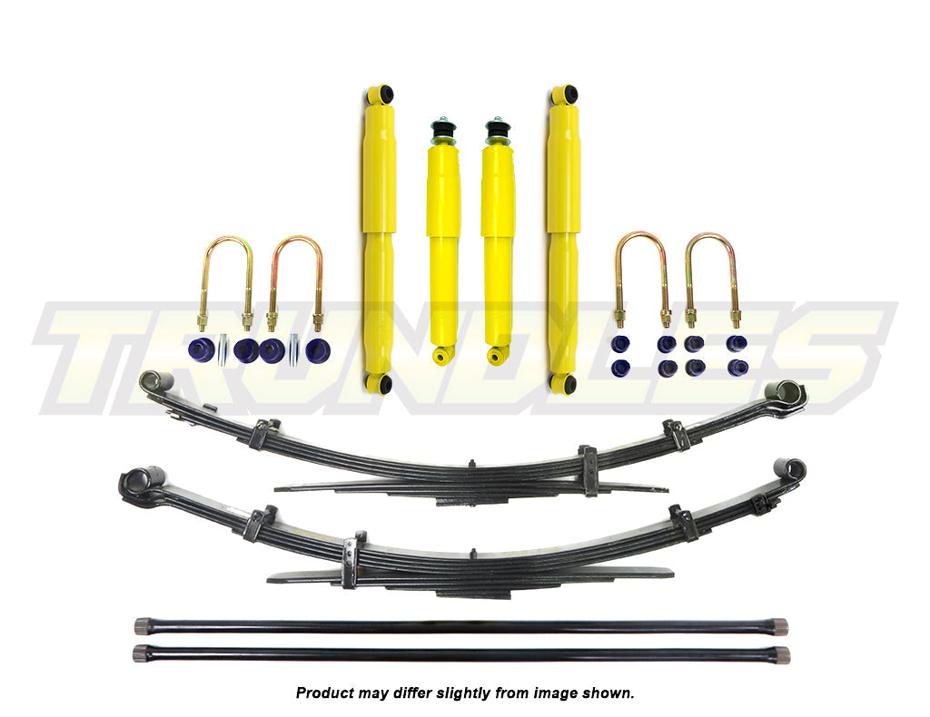 Kit Contents | 2x Dobinsons Heavy Duty Front Shocks, 2x Dobinsons Heavy Duty Rear Shocks, 2x Dobinsons Rear Leaf Springs, 1x Dobinsons Leaf Bush Kit, 2x Dobinsons U-Bolt Kits |