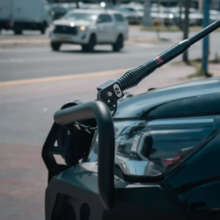 It can be mounted on a standard bull bar tab with a 16mm hole or a bull bar antenna bracket and even on a roof rack.