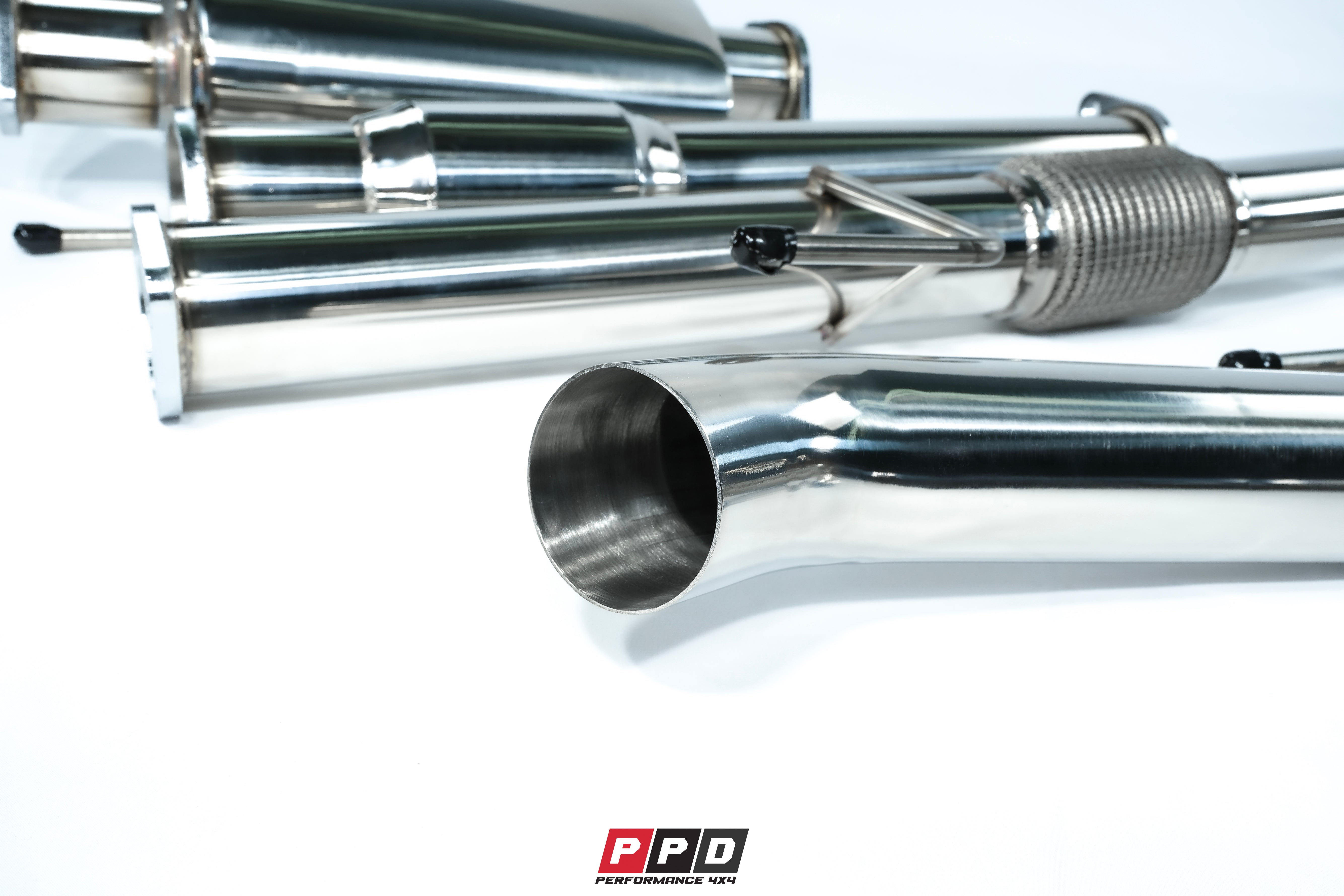 Replace the restrictive factory exhaust system with this brand new PPD Performance Polished Stainless Steel unit.